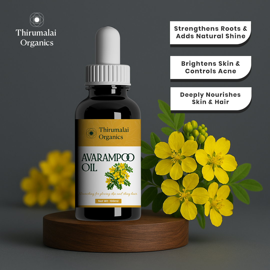 Crafted from freshly dried and finely powdered Avarampoo flowers, this oil delivers deep nourishment to the scalp, strengthens hair roots, and helps control hair fall while adding a soft, natural shine.