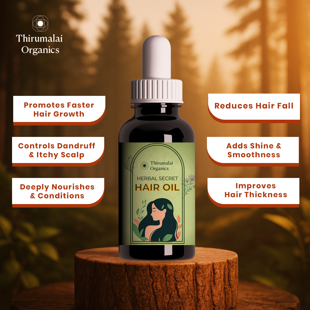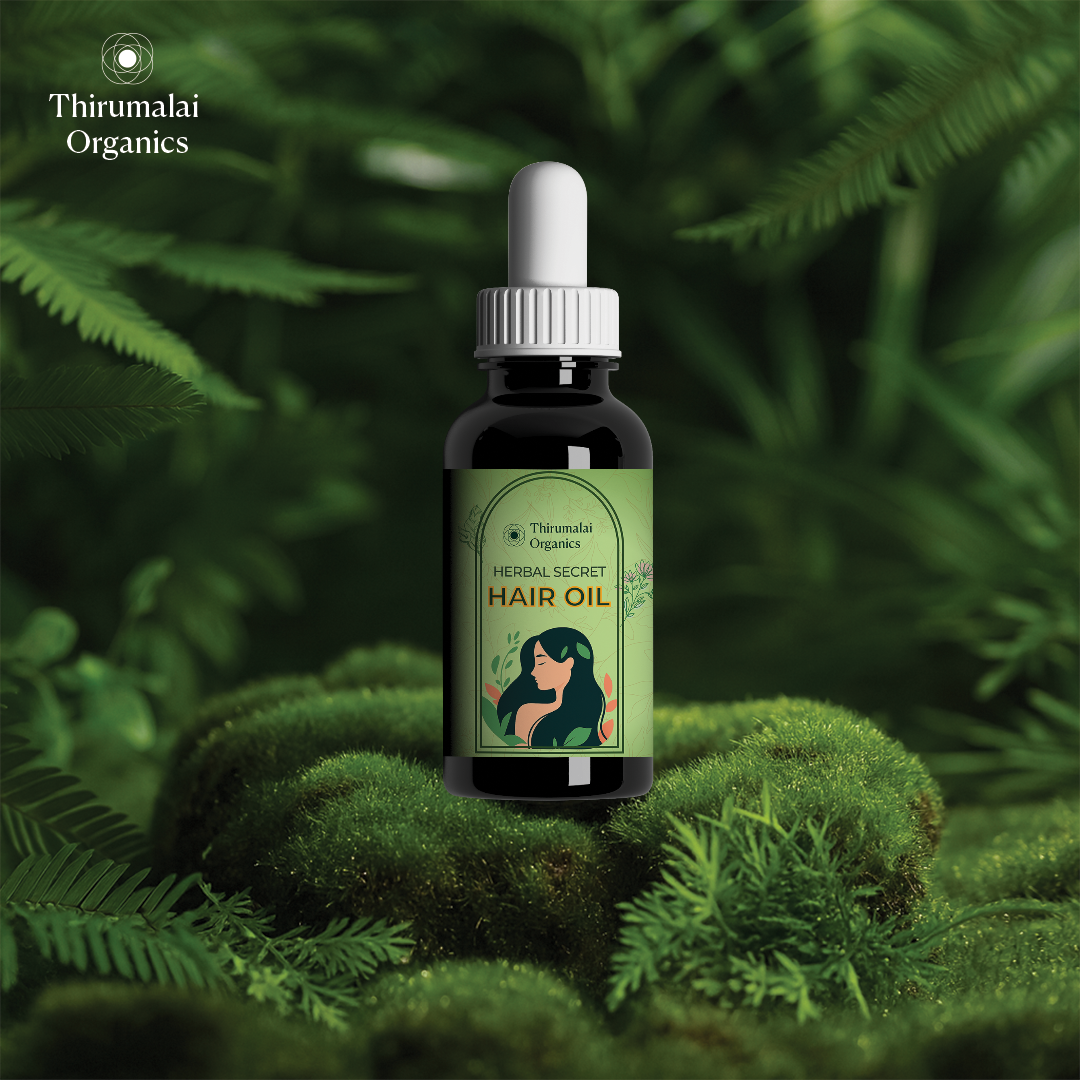 This heritage recipe brings together Karisalankanni, Rosemary, Vetiver, Badam, Blackseed, Aloe Vera, Hibiscus, Avarampoo, Amla Seed, Moringa, Small Onion, Fenugreek, Curry Leaves, Clove, Licorice Root, Henna Leaves, Valampuri Kaai, Idampuri Kaai, Panneer Rose, Flax Seed, Senbagam, Nandhiyavattam, Neem Leaves, and six additional rare Ayurvedic botanicals known for their scalp-cooling, root-strengthening, and shine-enhancing properties.
